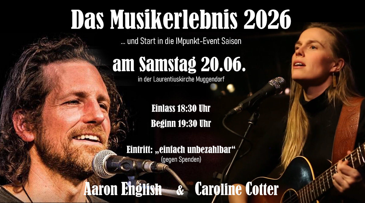 Erleben Sie ein unvergessliches Musikerlebnis mit Aaron English, der bereits 2025 unsere Gemeinde verzauberte, und der gefeierten Singer-Songwriterin Caroline Cotter. Dieses exklusive Konzert in der intimen Laurentiuskirche Muggendorf verspricht am 20. Juni 2026 ein emotionales Highlight der IMpunkt-Event Saison zu werden.